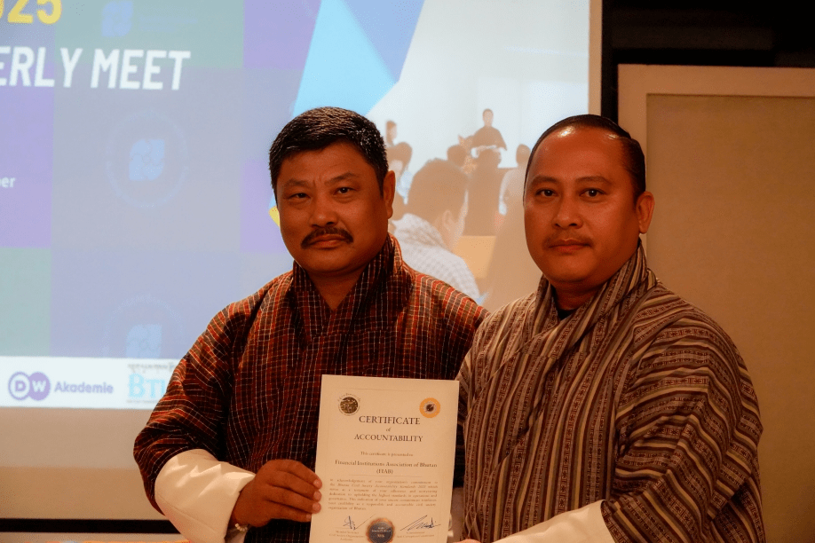 The Financial Institutions Association of Bhutan (FIAB) is pleased to receive the certificate of recognition from the Civil Society Organizations Authority (CSOA) and the Anti-Corruption Commission (ACC) for standing out first amongst 54 existing registered CEOs with a score of 98% in the Bhutan Civil Society Accountability Standard (BCAS) assessment for the FY 2024-25.